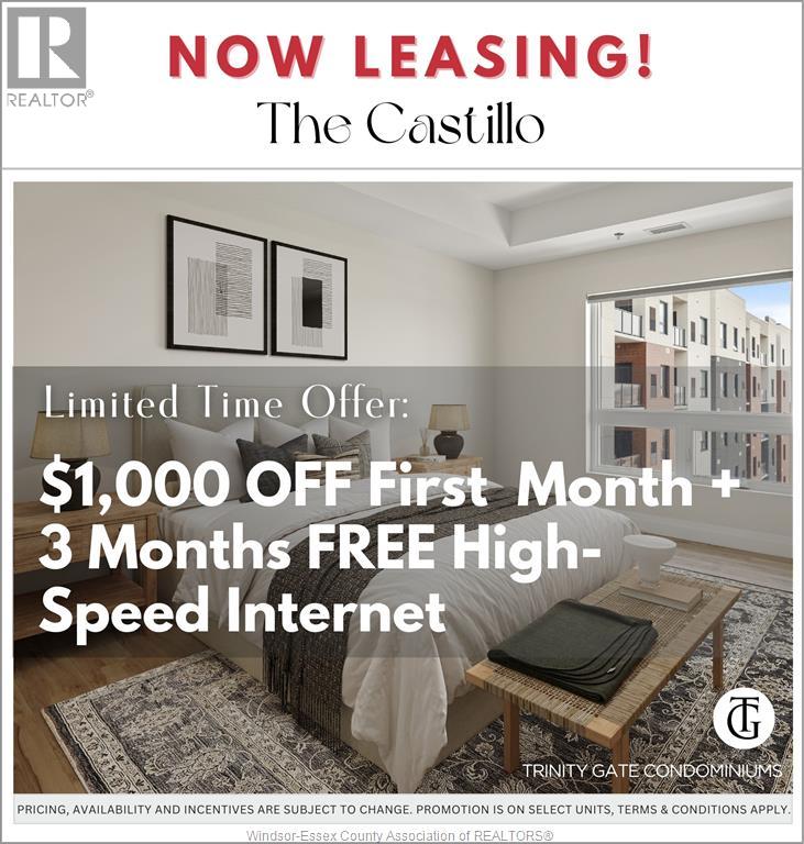 Welcome to Trinity Gate Condos, Award-winning development and proud winner of the 2024 WEHBA Award of Distinction.Phase3-Castillo now available leasing,with occupancy Mar 1, 2026. Opportunity to be 1st tenant in brand-new, professionally managed smart building with luxury finishes throughout. 1068sqft. Morano I unit offers 2B and 2 Bath with custom-designed open-concept kitchen,dining,and living area. Vinyl plank flooring,porcelain tile,quartz countertops, upgraded Whirlpool appliances,9-ft ceilings, spacious PB W walk-in closet and ensuite. in-suite laundry/storage, private balcony with glass railing,10""wall pad with controls for HVAC, security cameras,and video feed to the lobby. Amenities: Sit-in lobby with free wifi, Gym, party room, outdoor pavilion, EV chargers, Handicapped and visitor parking, Keyless access system, and Neighborhood commercial s-pharmacy, express, café. Located near Nextstar,Amazon,Minth Group,Bus Stop,schools,parks,trails,shopping, restaurants, 401 and airport. Rent is 2395+utilities,One outdoor parking and grounds maintenance included,no condo fees. Mandatory Bell Fibre high-speed internet (Smart One) $100/month (HST included, unlimited Wi-Fi). Min 1-yr lease.application, references, credit & employment check required. Lockers and bicycle racks (available for $50 per month). 80+ units available – pick your ideal home today. Promo-$1000 off + 3 Months Free Internet for 2b2b units March Move-ins Only. (id:4555)